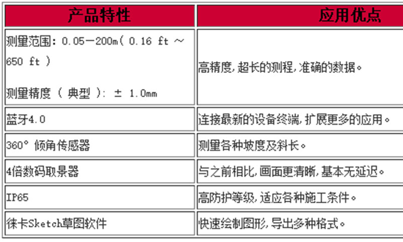 全新一代手持测距仪D510,在外观与内涵都有极大的突破,配置了最为先进的蓝牙4.0技术,支持与苹果终端设备连接;具有IP65的防护等级;全新的操作界面,直接内置计算器,每个功能都有相应的注释;360°的倾角传感器,让hth官方网页入口_hth(中国)有限公司官网无死角。