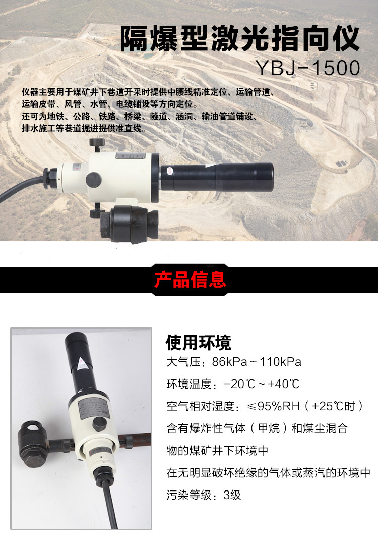YBJ矿用隔爆型激光指向仪是集电子、光学、精密机械等技术为一体的仪器。具有外形美观、体积小、重量轻、防爆等特点。仪器安装采用固定式,可快速固定在锚杆上。仪器可在360°范围任意粗调,微调准确;调节方便,制动可靠。产品采用自主研发的光学系统,可采用红、绿两种光源,光斑大小、射程满足矿下施工需求。仪器采用交直流转换电源模块,交流宽电压AC80V~AC245V供电,具有保护功能。